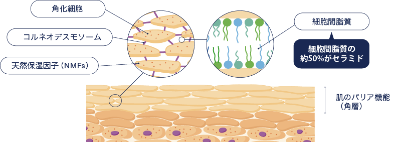 角層にある「肌のバリア機能」は、外部刺激から肌内部を守ったり、肌の水分蒸発を防いだりしています。そのバリア機能が弱まると、乾燥が進み、かさついたり粉ふきの原因となります。「肌のバリア機能」の重要な構成要素のひとつ、「細胞間脂質」は、細胞と細胞の間を満たす“モルタル”のような働きをしていて、その約50%がセラミドで構成されています。